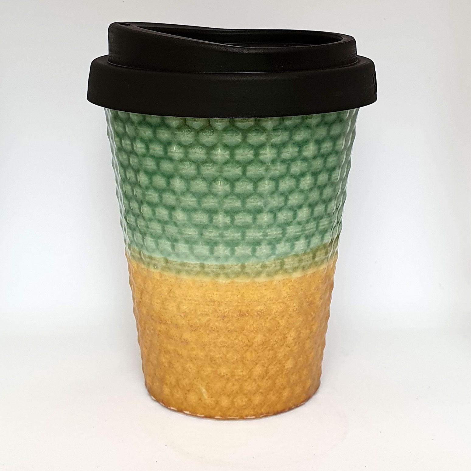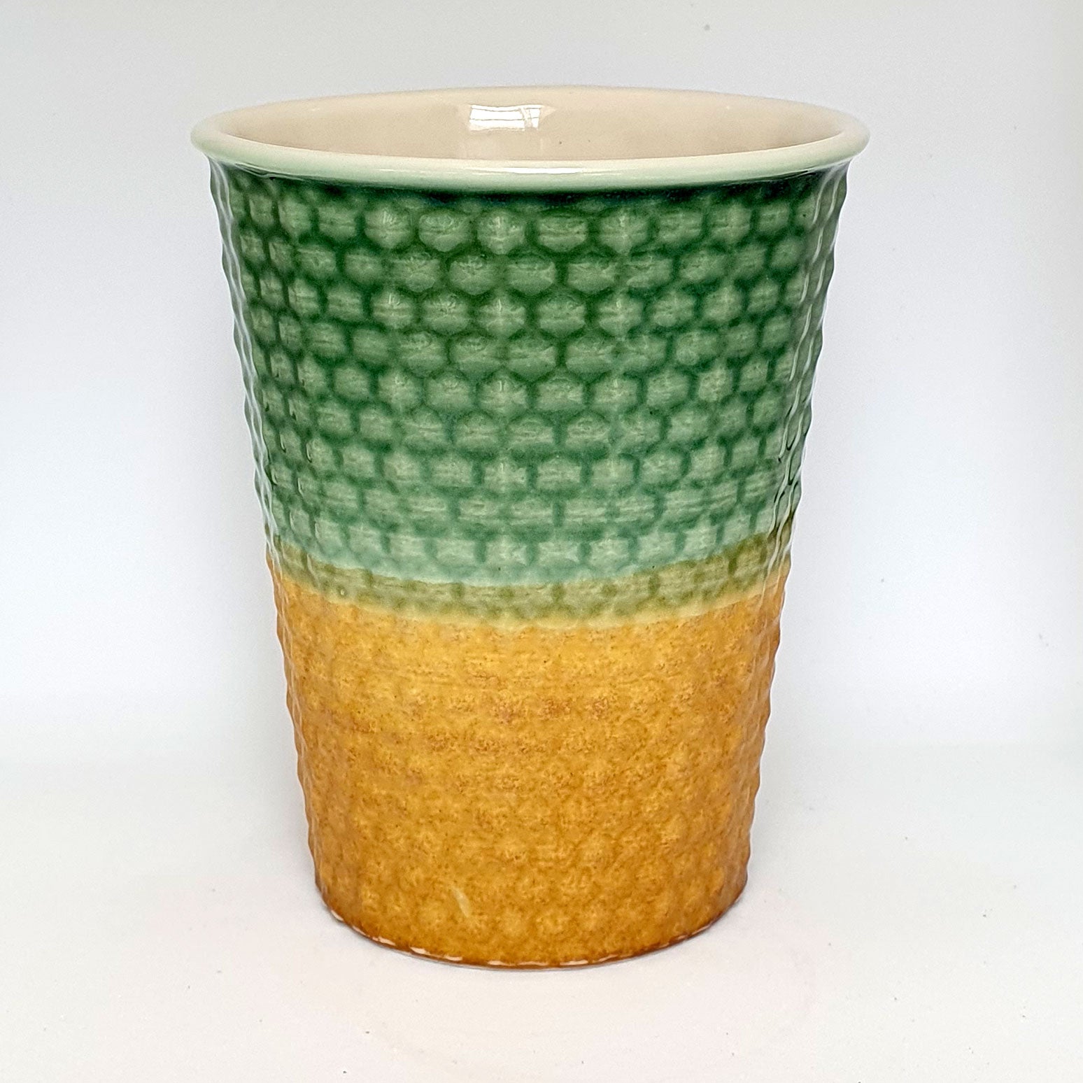 A clean alternative to the disposable takeaway paper coffee cup. These cups are not mass-produced from plastic or glass, or imported. Daniel Jessep's cups are handmade in New Zealand from a base of brilliant white New Zealand kaolin clay. A high-fired porcelain ceramic cup, coated with a clear gloss glaze on the inside and crafted with a dimple texture on the outside. The outside upper jade glaze has a gloss finish and the lower gold glaze is semi matte.