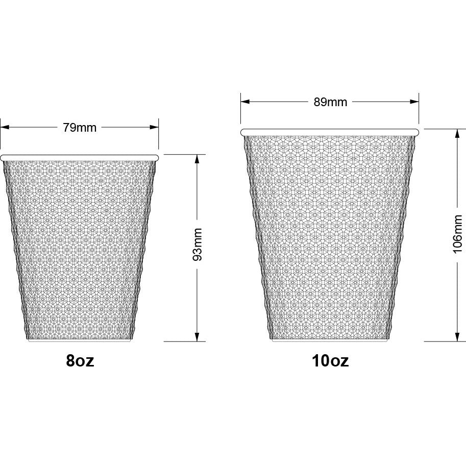 The cups come in two sizes; matched to the barista standard paper takeaway coffee cup 8oz (230ml) and 10oz (295ml).