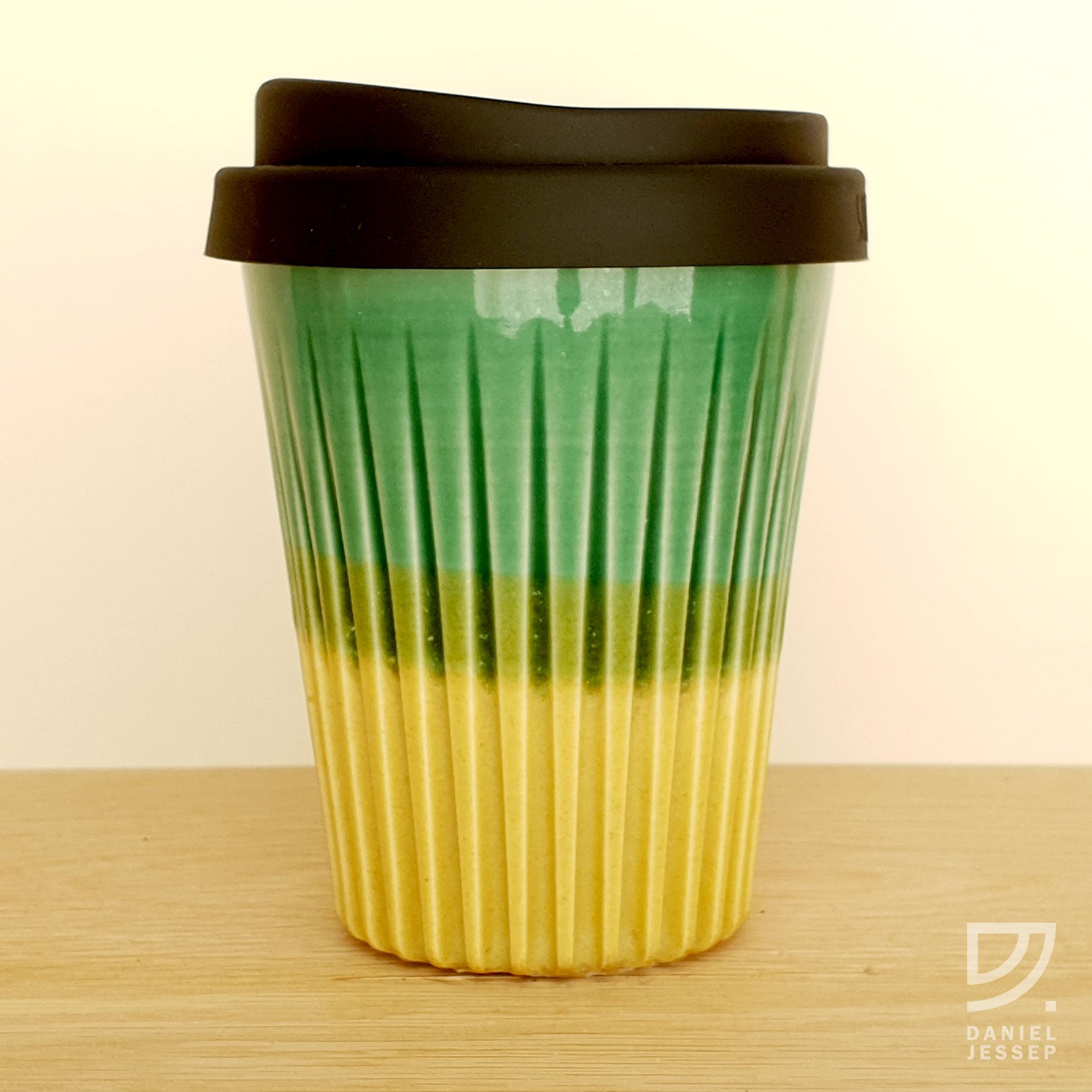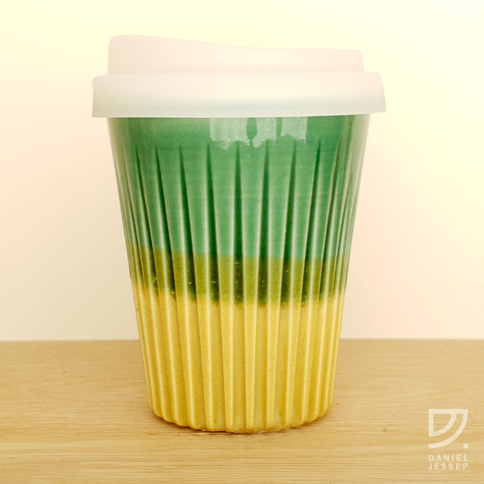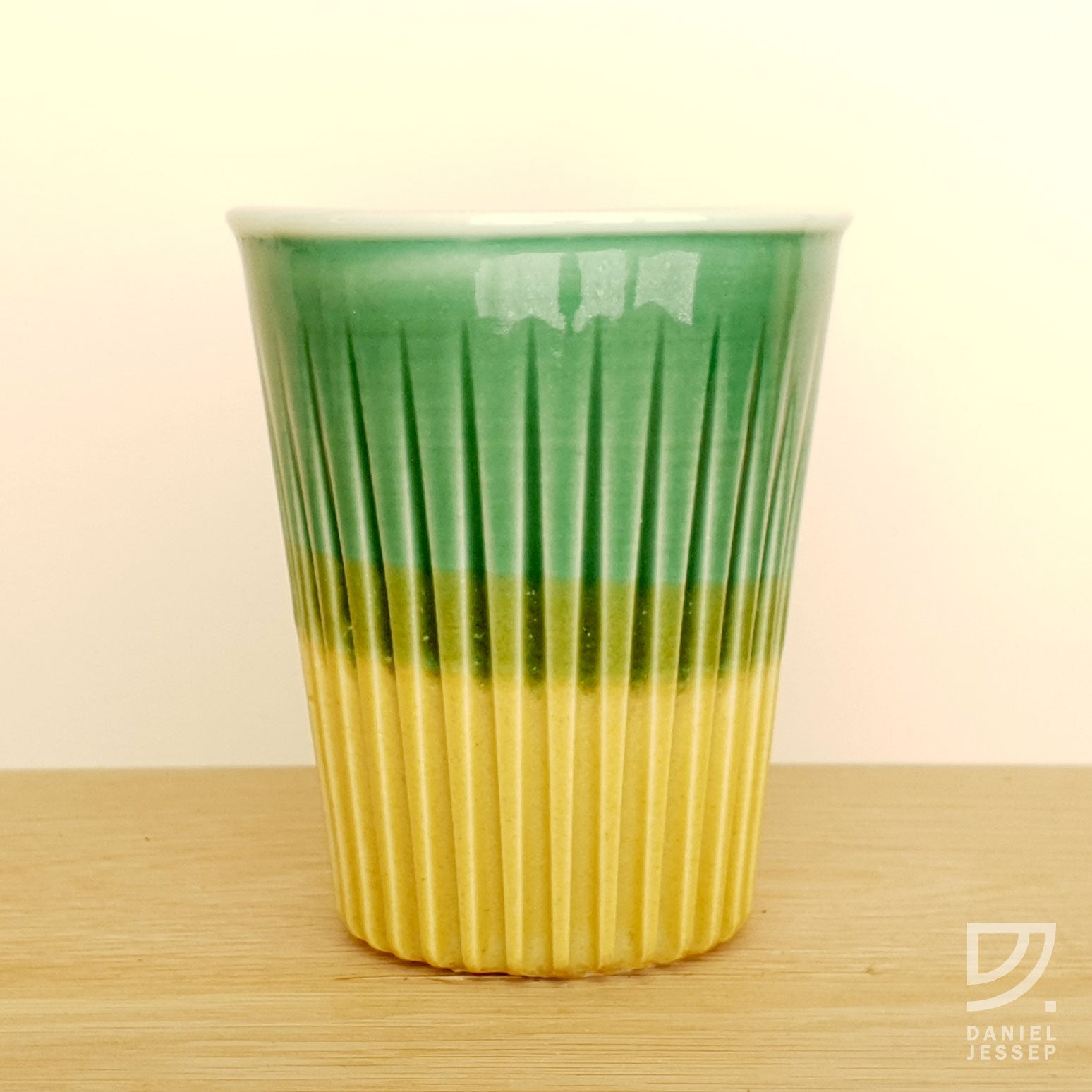 A clean alternative to the disposable takeaway paper coffee cup. These cups are not mass-produced from plastic or glass, or imported. Daniel Jessep's cups are handmade in New Zealand from a base of brilliant white New Zealand kaolin clay. A high-fired porcelain ceramic cup, coated with a clear gloss glaze on the inside and crafted with a fluted texture on the outside. The outside jade glaze has a gloss finish and the lower gold glaze is semi matte.