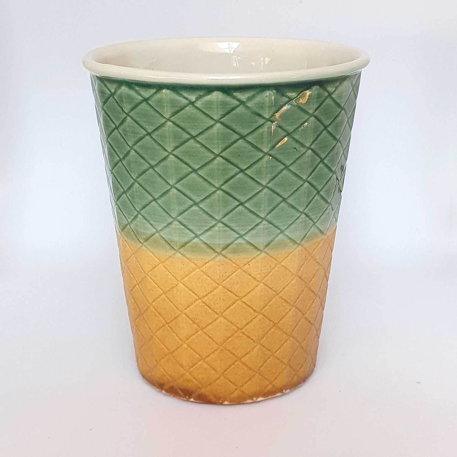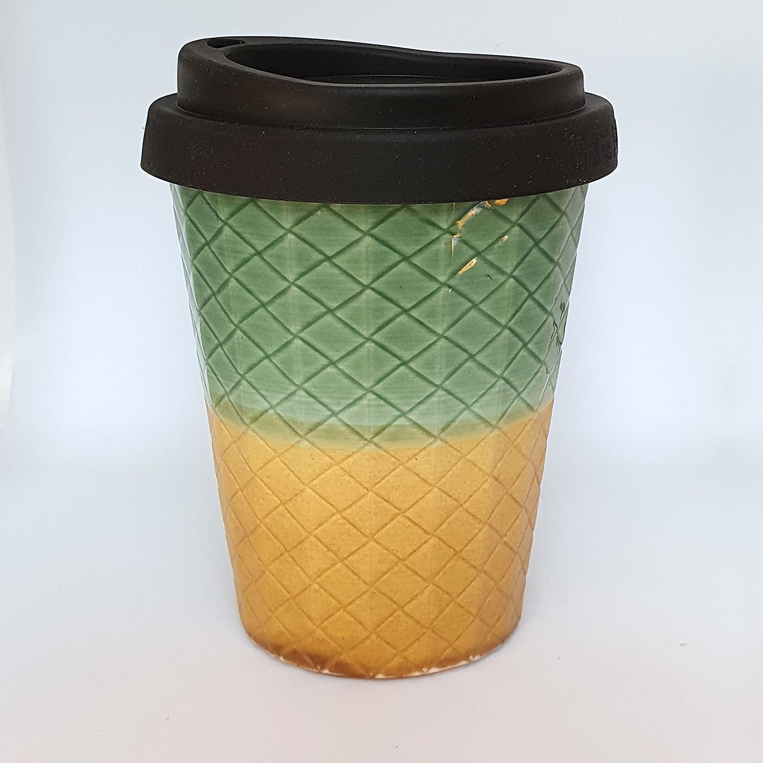 A clean alternative to the disposable takeaway paper coffee cup. These cups are not mass-produced from plastic or glass, or imported. Daniel Jessep's cups are handmade in New Zealand from a base of brilliant white New Zealand kaolin clay. A high-fired porcelain ceramic cup, coated with a clear gloss glaze on the inside and crafted with a weave texture on the outside. The outside upper jade glaze has a gloss finish and the lower gold glaze is matte.